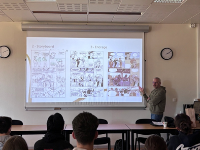 Nicolas Wild a rappelé ensuite comment se compose une BD et donné quelques consignes de travail : chaque élève ou binôme d’élèves écrira un scénario d’une page, racontant une situation de discrimination dans un univers décalé.